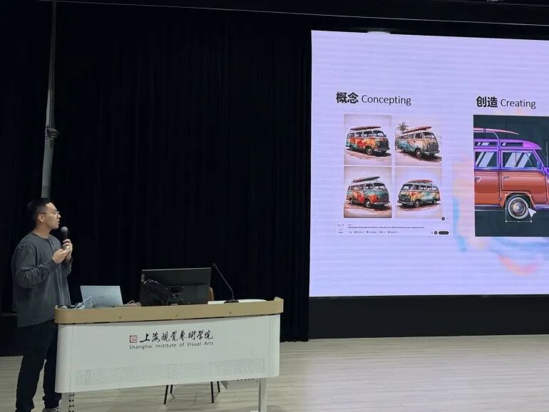 图虫创意产品经理李奕轩带来的分享,则聚焦在Adobe AI设计插件应用与版权知识科普两大核心。他不仅在现场直观演示了AI插件在创意辅助中的实操效果,更着重强调了版权知识对设计从业者的根基性作用。他的这一观点,也得到了刘泽斌老师的高度认同——对于正处于专业积累期的设计学子而言,厘清版权归属、规避侵权风险,是从学生身份向设计师身份转变的关键一步。尊重原创、严守版权规范,从来不是空洞的口号,而是每一位设计人安身立命的基本素养,更是未来职业道路上不可逾越的“红线”。