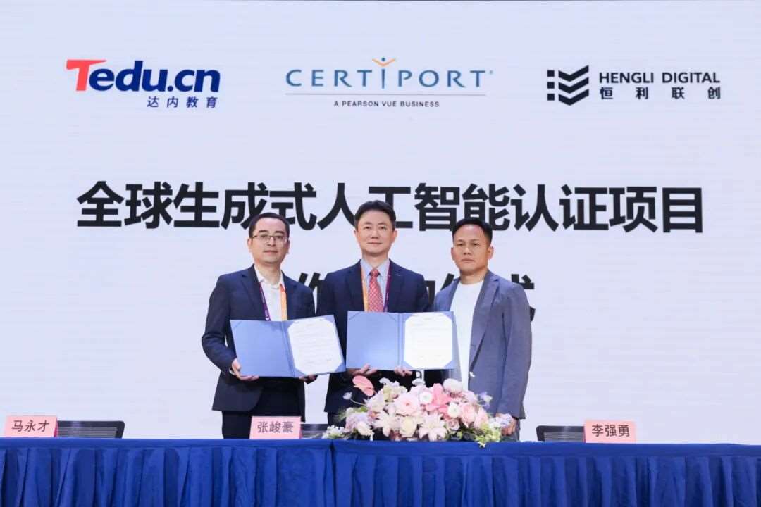 赛事期间举办的《CERTIFIED!培生全球教育者研讨会中国分会》上,Certiport中国运营管理中心——上海恒利联创与知名教育集团达内教育,就培生集团(Pearson VUE) 旗下职业和技能认证业务Certiport全球生成式人工智能认证(Generative AI Foundations,以下简称:GAI认证)项目正式签署战略合作协议,共同推动中国用户标准化、系统化地学习并获得全球生成式人工智能认证。恒利联创董事长李强勇、达内教育总经理马永才出席签约仪式,Pearson VUE Certiport 大中华区总经理张峻豪作为见证嘉宾。此次签约标志着GAI认证简体中文版的亮相,此外,双方还同步续签了Adobe Certified Professional(以下简称:Adobe国际认证)战略合作协议,进一步深化在数字化人才培养领域的布局。