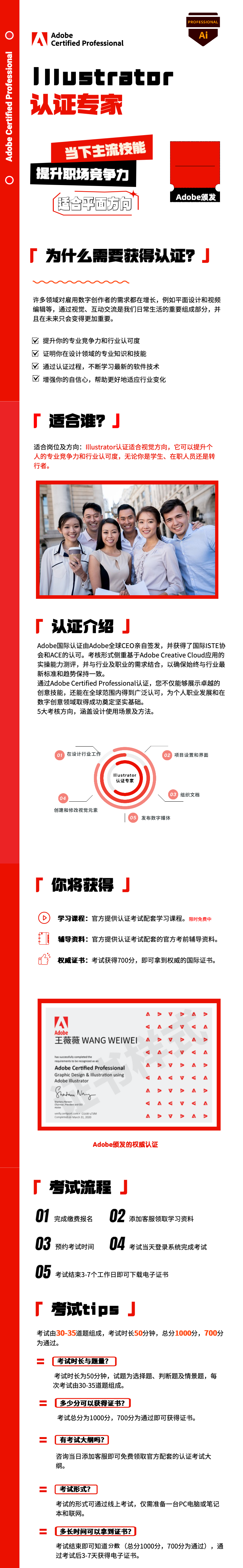Adobe核心技术+岗位能力双重考核(选择题/情景模拟/实操题),满分1000分需达700+通过,当场出分确保真实水平。